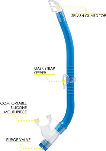 Der Schnorchel verfügt über einen Spritzschutz am oberen Ende und ein Ventil am unteren Ende, um eine verbesserte Entwässerung zu gewährleisten. Das weiche Silikon-Mundstück bietet bequeme Passform, während der Clip für die Befestigung am Maskenband sorgt.