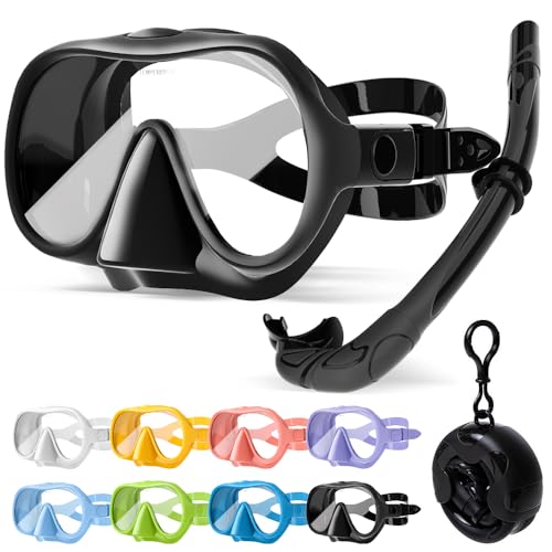 HINATAA Schnorchelset Erwachsene, Macaron Rahmenlose Taucherbrille, 180° Ultra Weitsicht Anti Nebel Schnorchelmaske, Anti-Leck Professionelles Tauchmaske, Schwimmbrille Frauen Männer (Schwarz Set)
