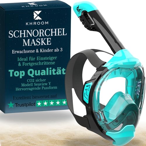Khroom Schnorchelmaske Erwachsene & Kinder ab 3 Jahre | CO2 sicher | Vollgesichtsmaske mit Easy-Breath System | Schnorchelset Alternative | Seaview Y Tauchmaske Erwachsene/Kinder (XS Türkis)